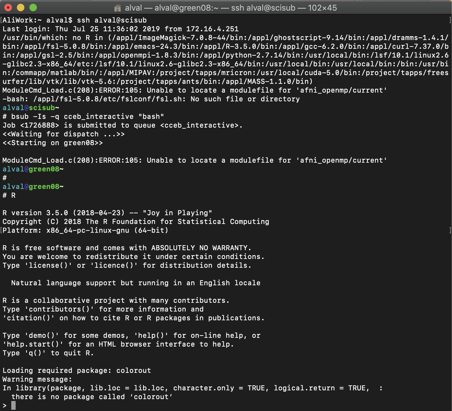 Now that you are on an execution host you need to load R or another computing language. To load R on the cluster just type module load R/version. I personally have been using R version 3.5.0 on the cluster so I’d type module load R/3.5.0. In a later blog post, I’ll discuss bash aliases and how you can bypass typing module load R/3.5.0 before opening R. If you want to see what other versions of R are available on the cluster type module load R then hit tab twice. You will see some output with all the different versions installed. This is an excellent resource if the package you want to use requires an older version of R. You won’t have to uninstall and re-install R on your local machine.