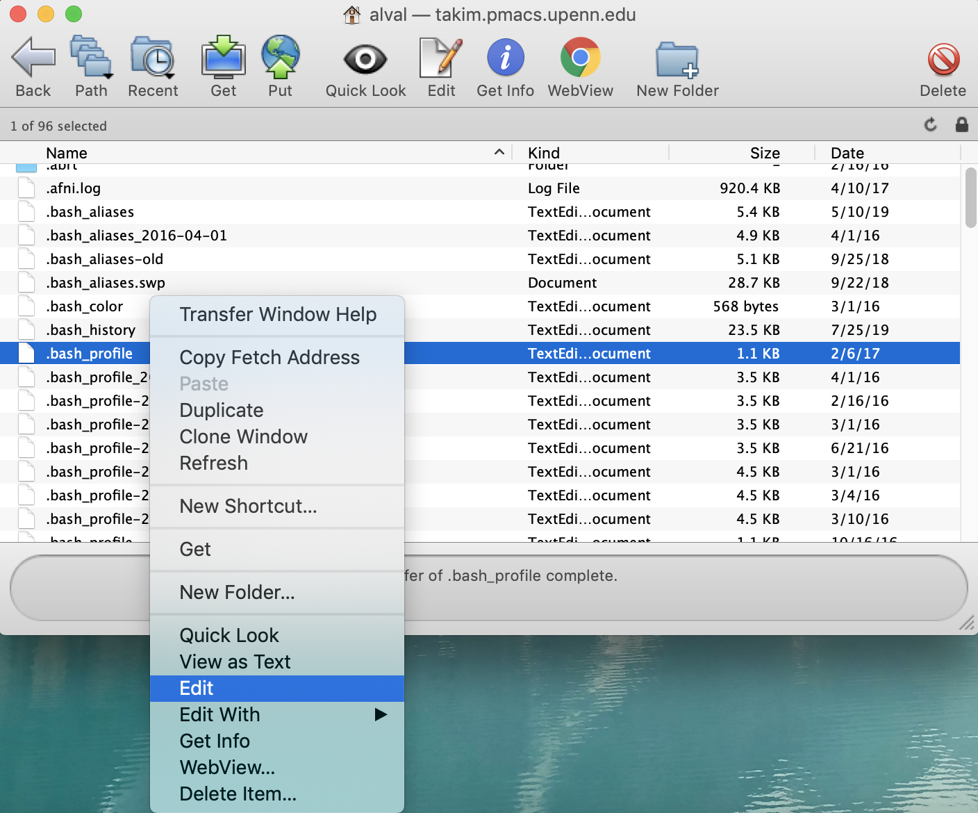 home directory. The full path is normally /pennkey/home..bash_aliases within Fetch and choose the option Edit. You might get a pop-up asking you to choose what program you’d like to edit the file with. I personally like TextEdit.