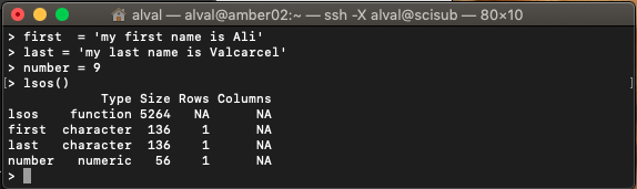 This function will return what objects you have loaded in your R environment with some information about the type of object, the size, and the dimension of the object. For example, if you run the lsos function from above and then run the following: